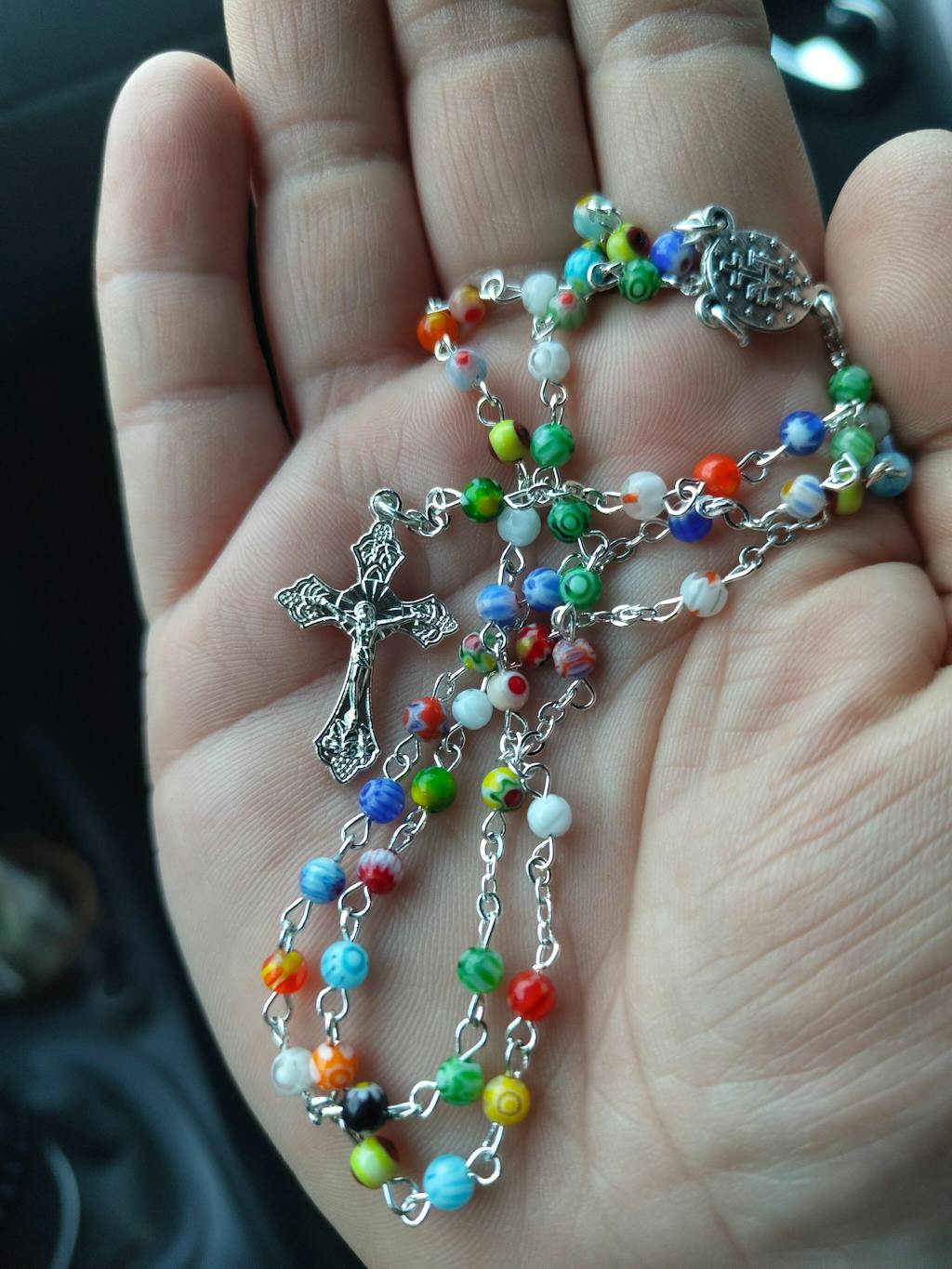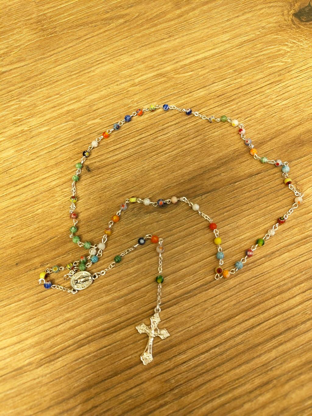 Ein sehr schönes Geschenk für Ihr Patenkind oder für sich selbst ist unser Rosenkranz mit bunten Glasperlen. Die zarten Glasperlen zeigen kleine Blumen und jede Perle sieht dabei einzigartig aus! Perfekt ist das Geschenkset für Zwillinge, da jeder Rosenkranz etwas anders angeordnete Perlen hat, sehen die Rosenkränze fast gleich aus, jedoch ist Ein wertvolles Geschenk für Mädchen und Jungs zur Erstkommunion oder auch zur Konfirmation, Firmung.