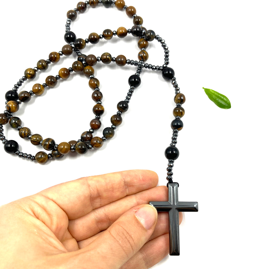 Material: Edelsteinperlen "Tigerauge", Zwischenperlen schwarz: Edelstein Onyx; kleine Zwischenperlen & Kreuz: Edelstein Hämatit