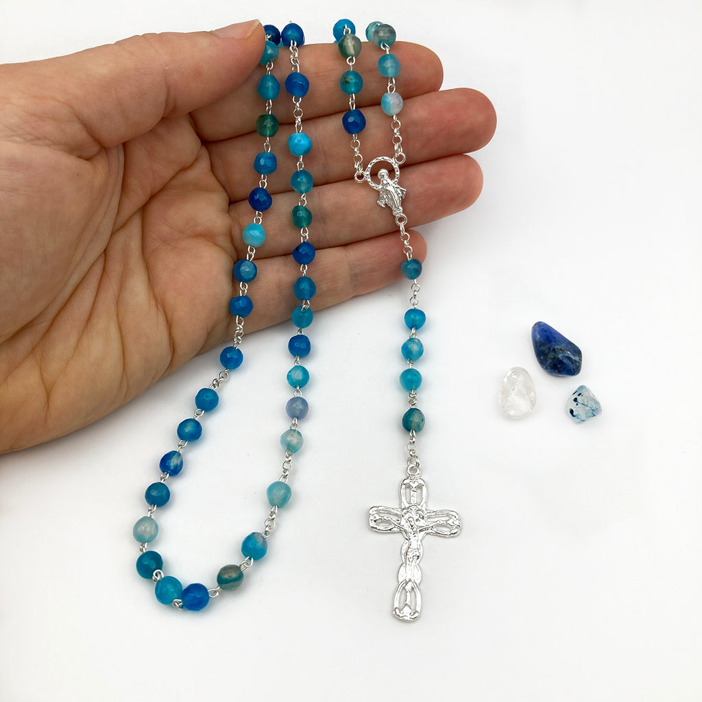 Dieser hochwertige Rosenkranz ist aus 925 Sterlingsilber und wird in Italien gefertigt. Er besticht durch seine sehr schönen Edelstein-Perlen aus Achat in verschiedenen Blau- und Türkistönen. Besonders zu beachten ist das sehr fein gearbeitete Kreuz. Die Edelsteinperlen liegen besonders gut in der Hand und bescheren dem Beter einen sehr angenehmen Griff der einzelnen Perlen.