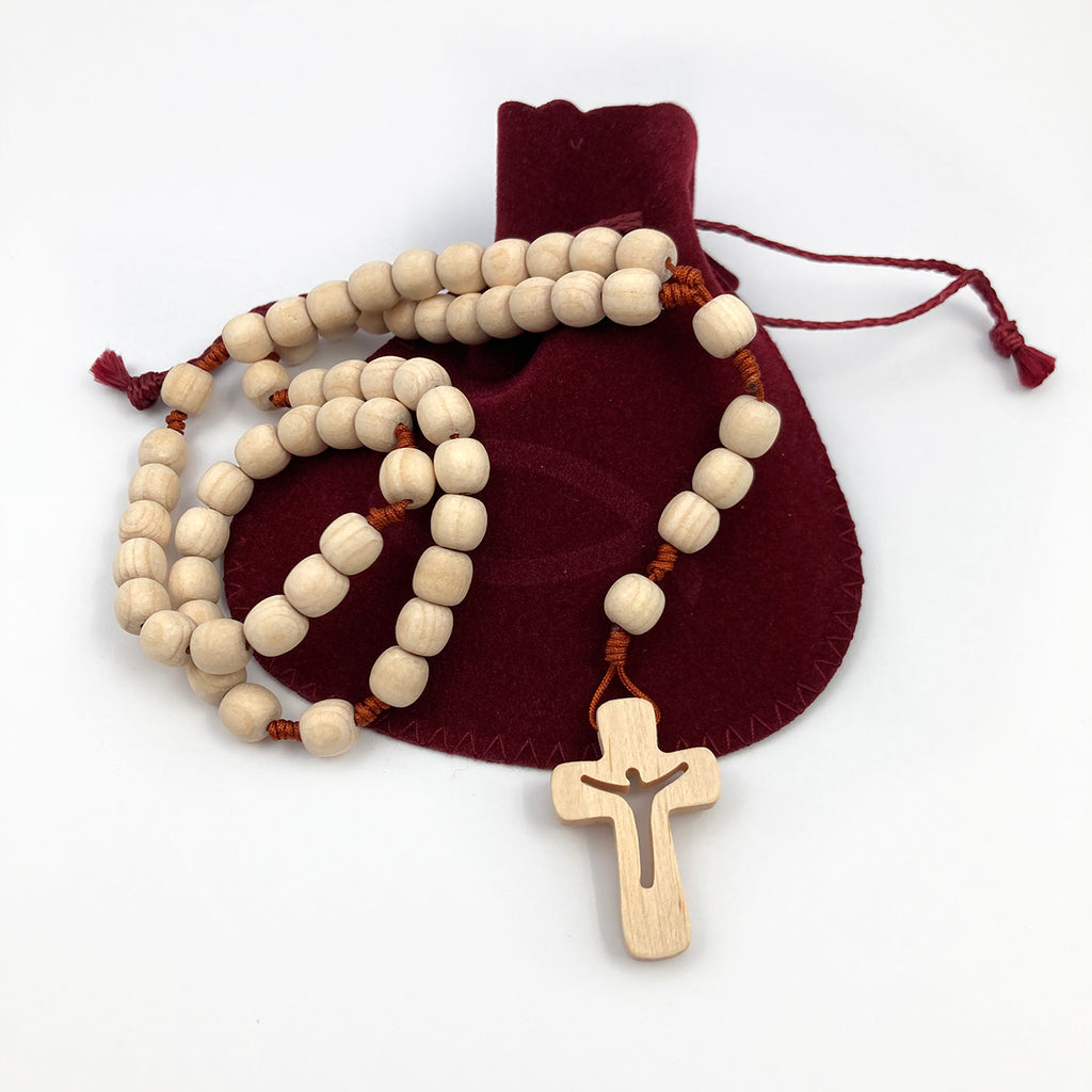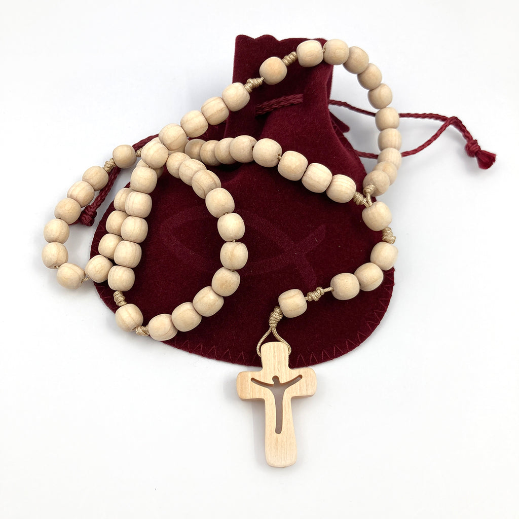 Du erhältst den Rosenkranz mit einem hochwertigen Samtbeutel sowie einer Karte, die Informationen zum verwendeten Zirbenholz enthält.