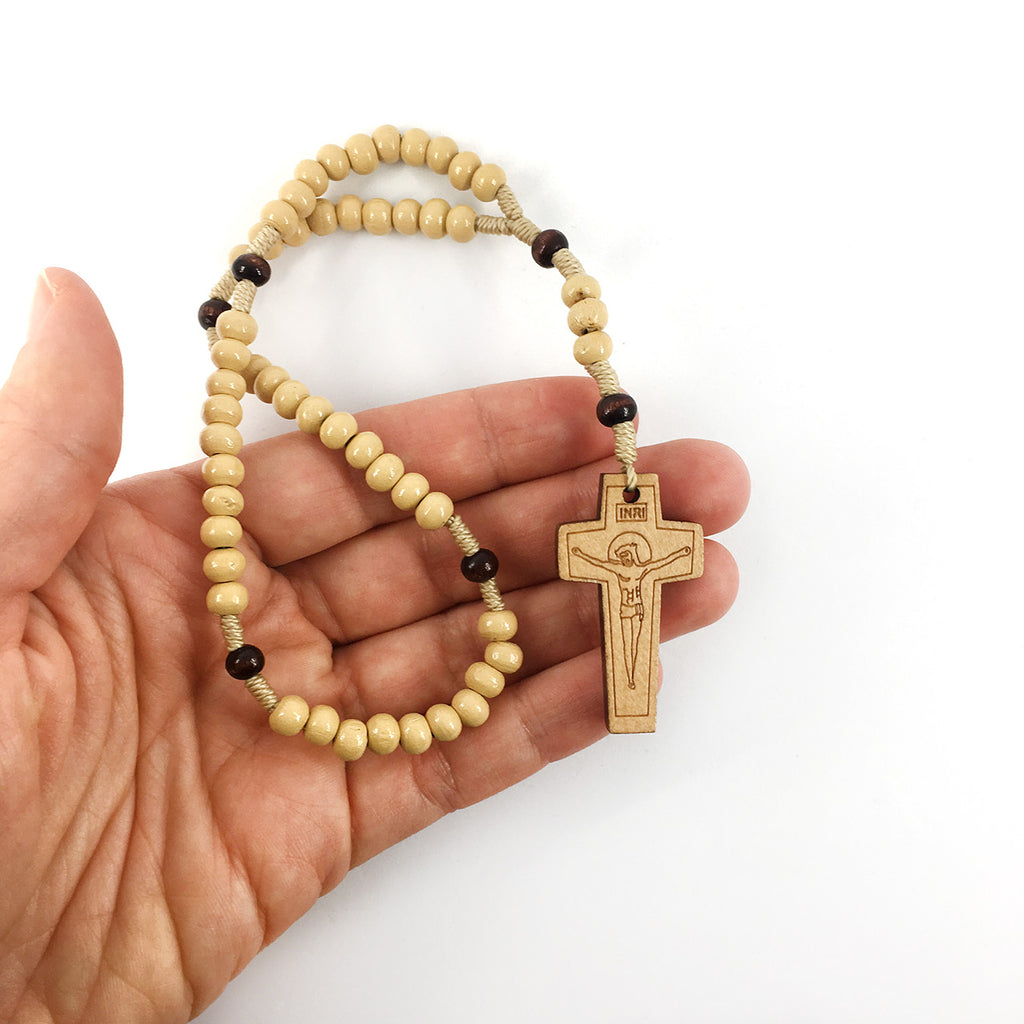 Der Rosenkranz aus Holz hat die ideale Länge, um um den Auto-Rückspiegel gehängt zu werden. Ein schöner Glücksbringer und Reiseschutz beim Autofahren!