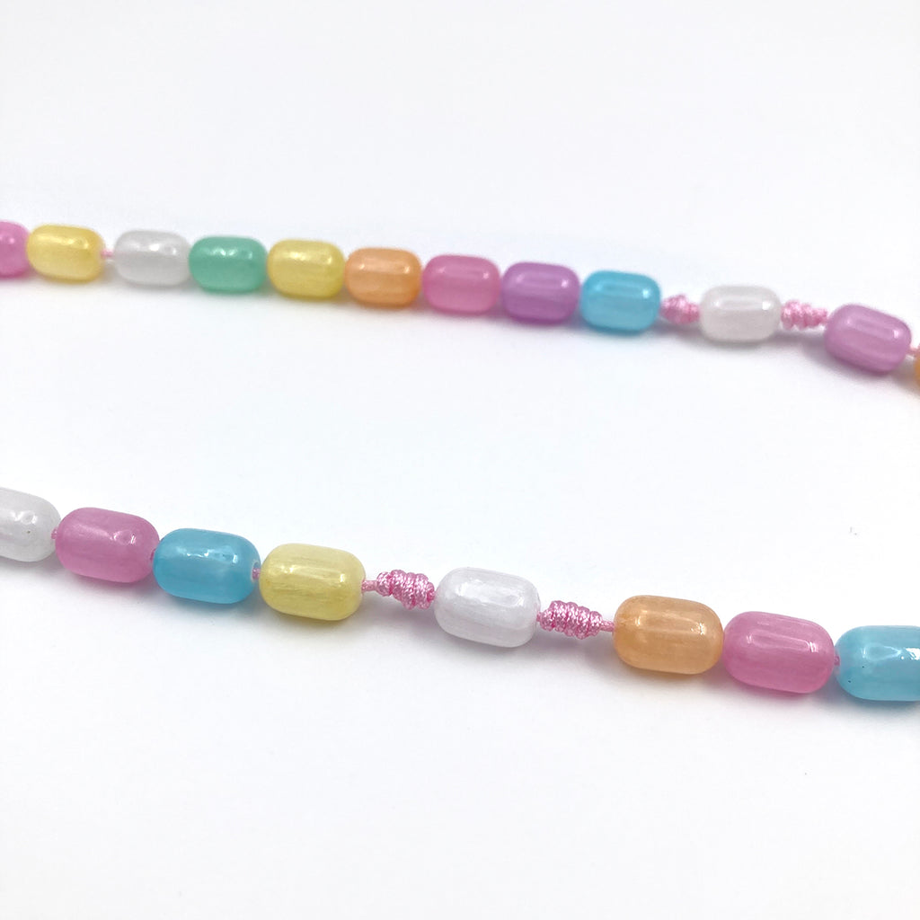 wurde in Niederösterreich handgeknüpft und bezaubert vorallem durch die schönen Perlen: Die hochwertigen Edelsteinperlen aus Selenit in bunten Farben.