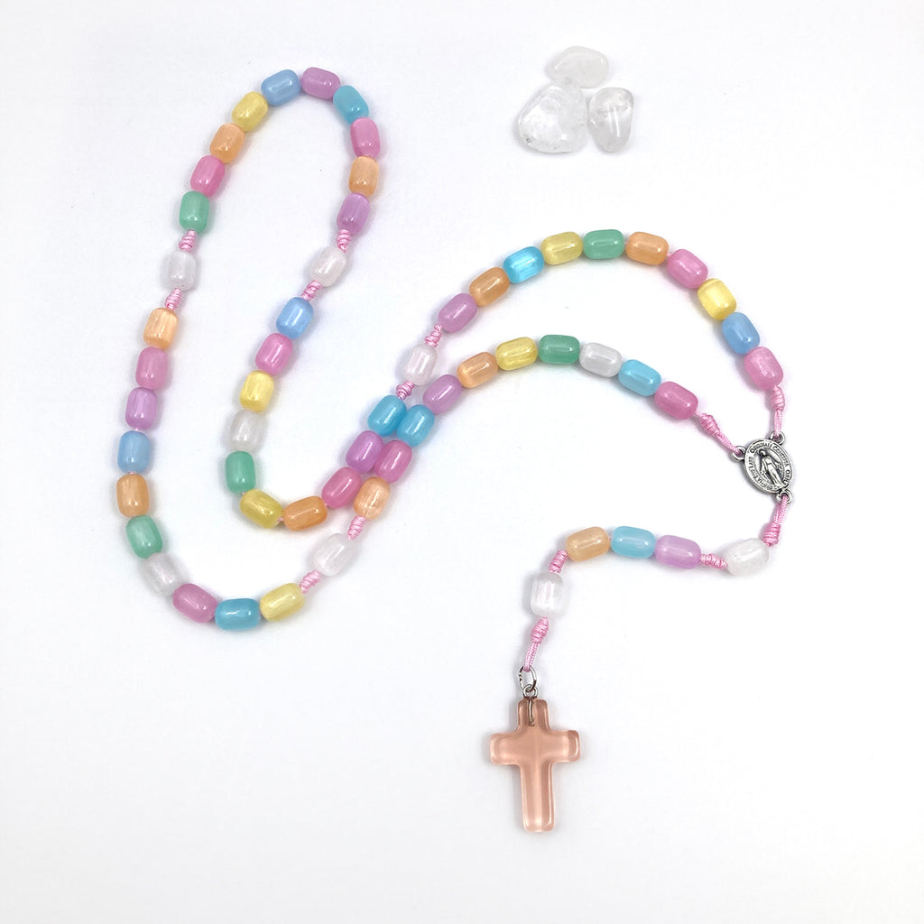 Material: Perlen aus Edelstein Selenit, Mittelstück aus Metall, Kreuz aus Acryl