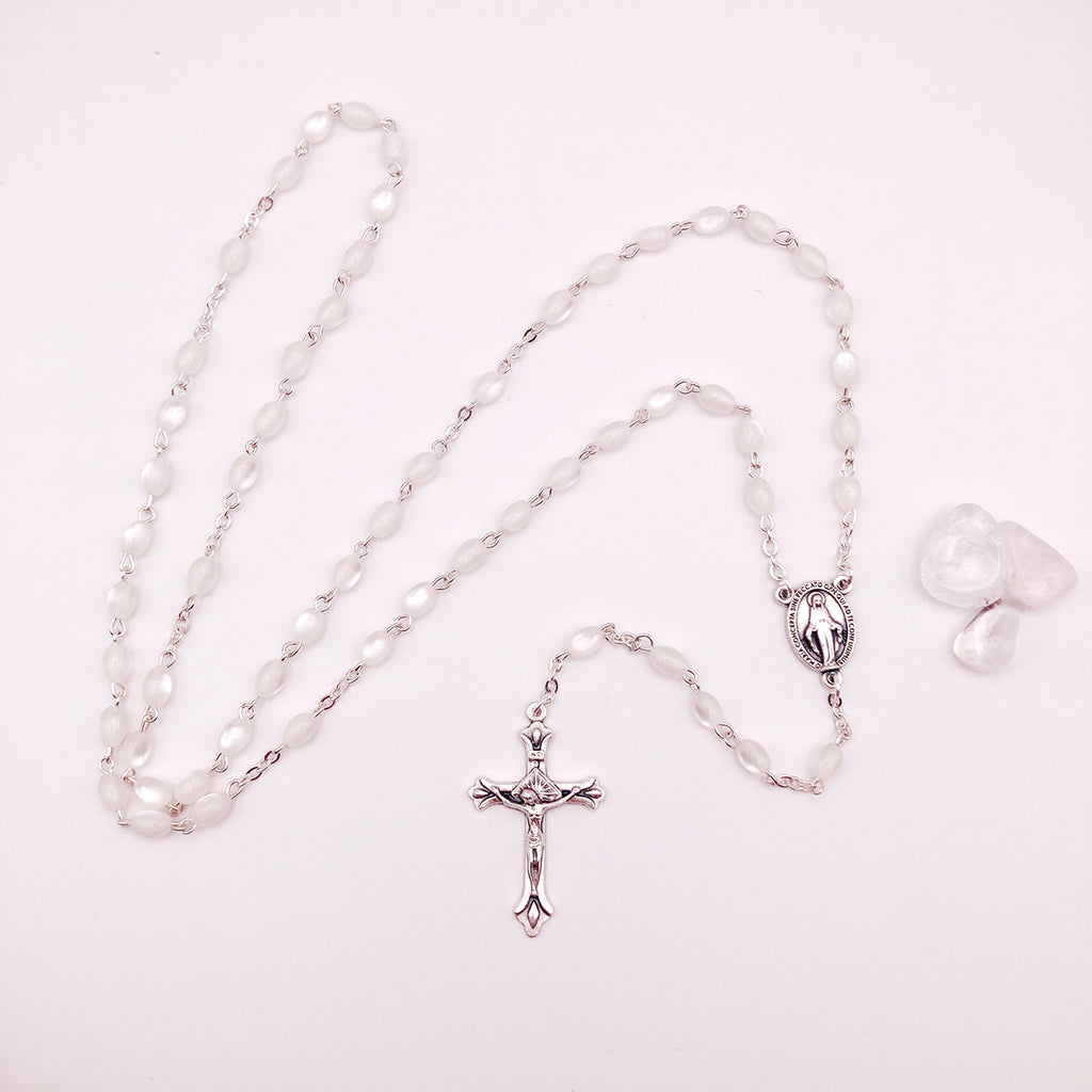 Die Perlen sind durch ihre Oberflächenstruktur sehr glatt und liegen dadurch besonders weich in der Hand. Also eine ideale Gebetskette für das Rosenkranzgebet. Die weißen Perlen schimmern ähnlich wie Perlmutt sehr schön bei Lichteinfall!