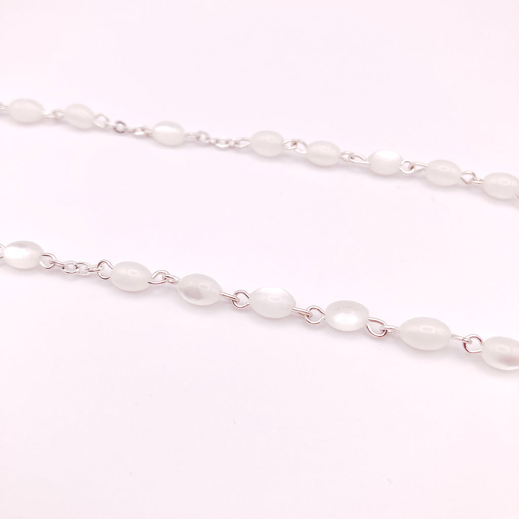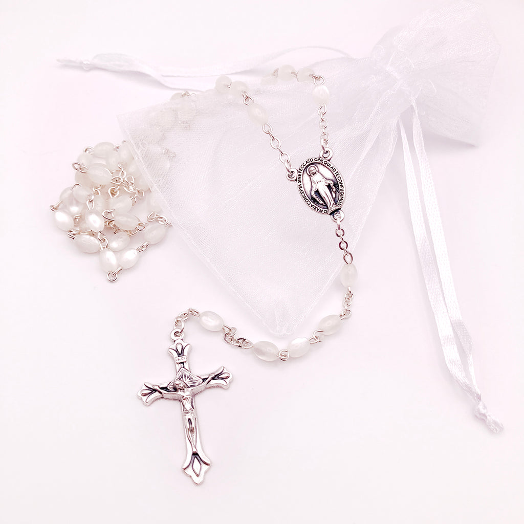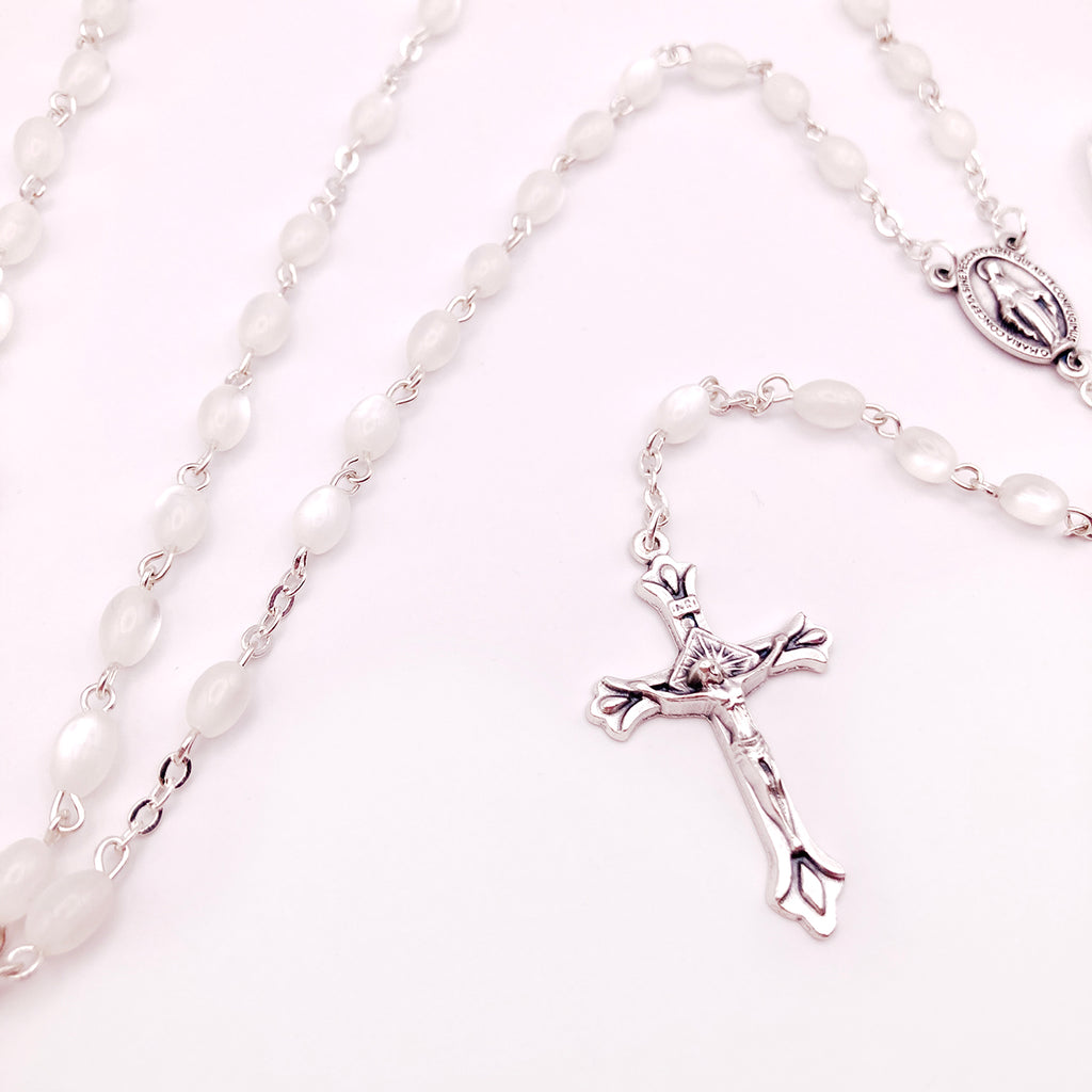Schöner Rosenkranz mit weißen, ovalen Perlen und schönem Kreuz!