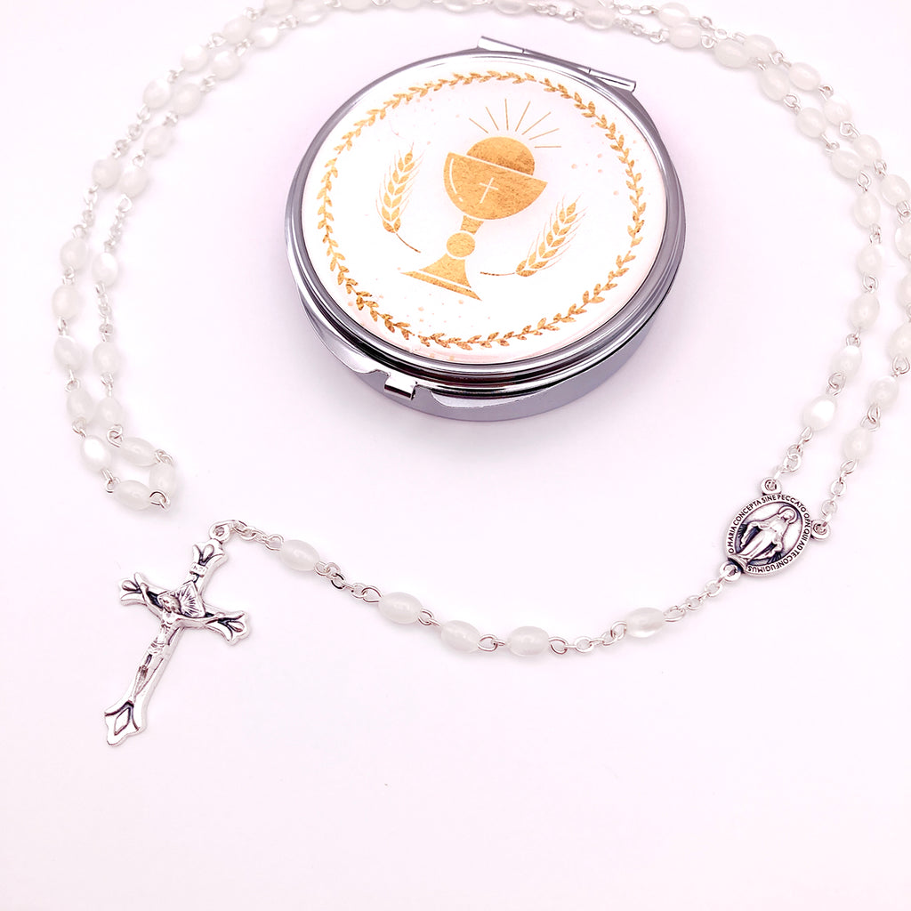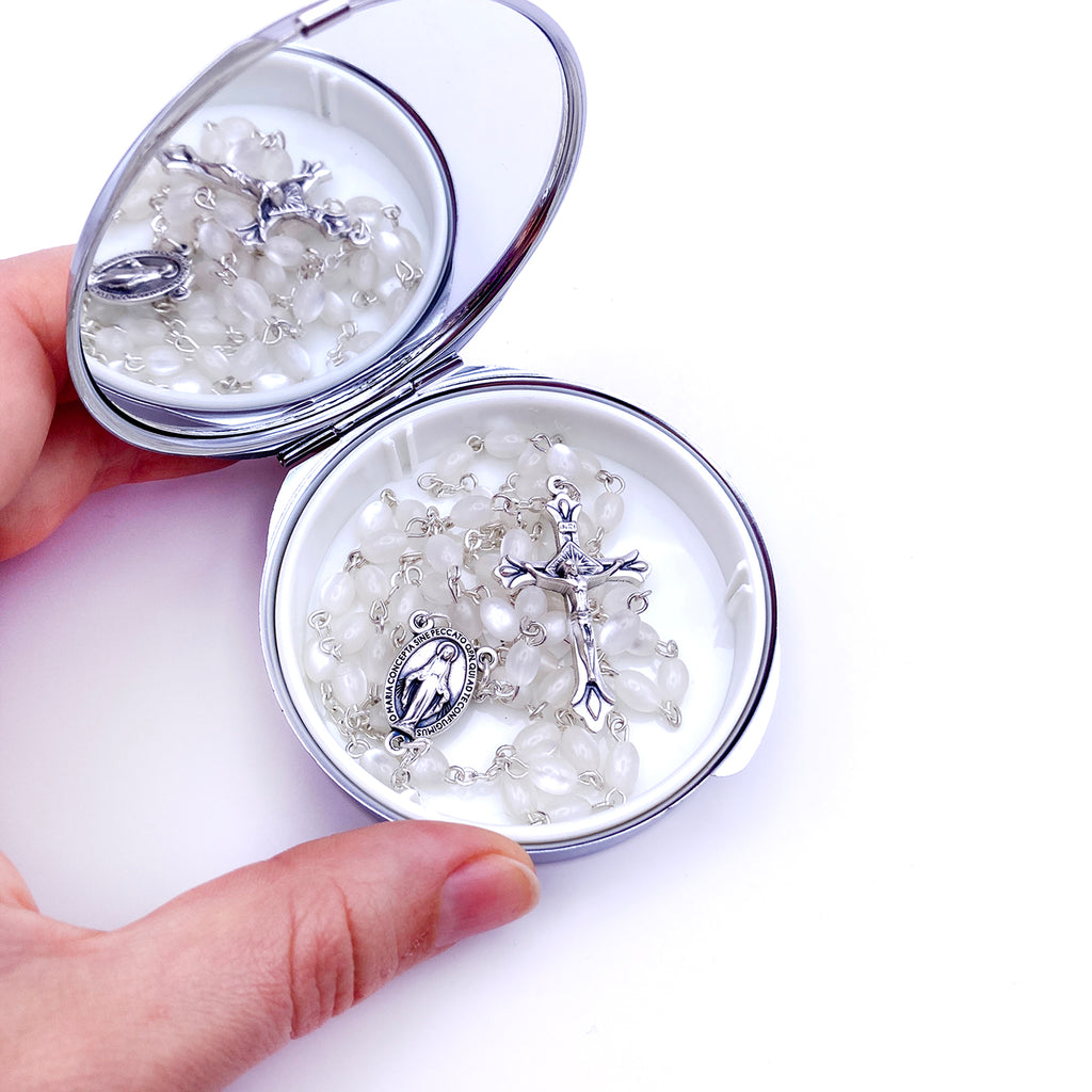 Sie haben die Wahl: Sie können den Rosenkranz solo - geliefert in einem hübschen Geschenkbeutel oder auch in einem schönen runden Metalletui mit Kelch-Motiv bestellen.