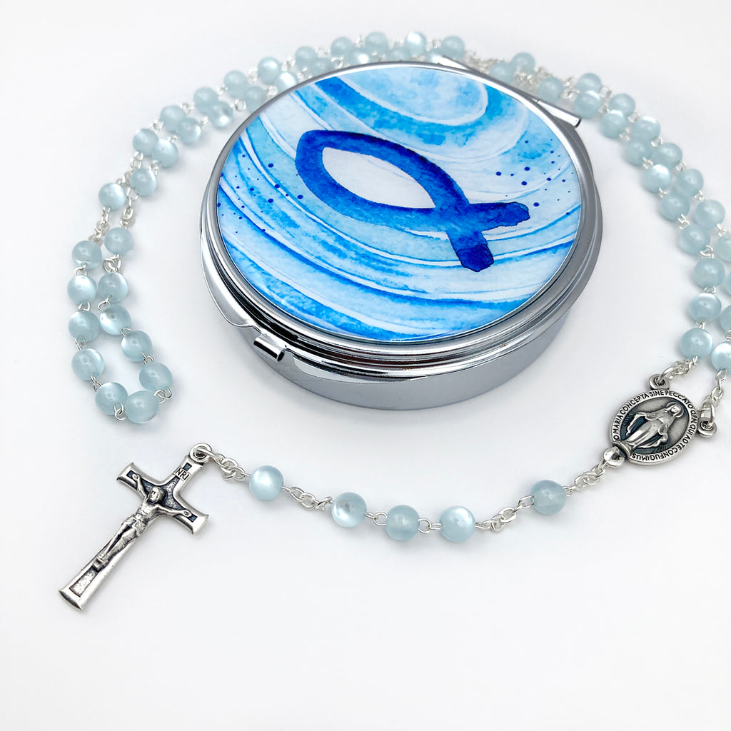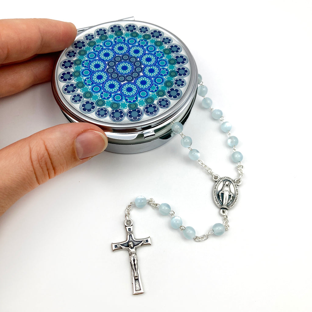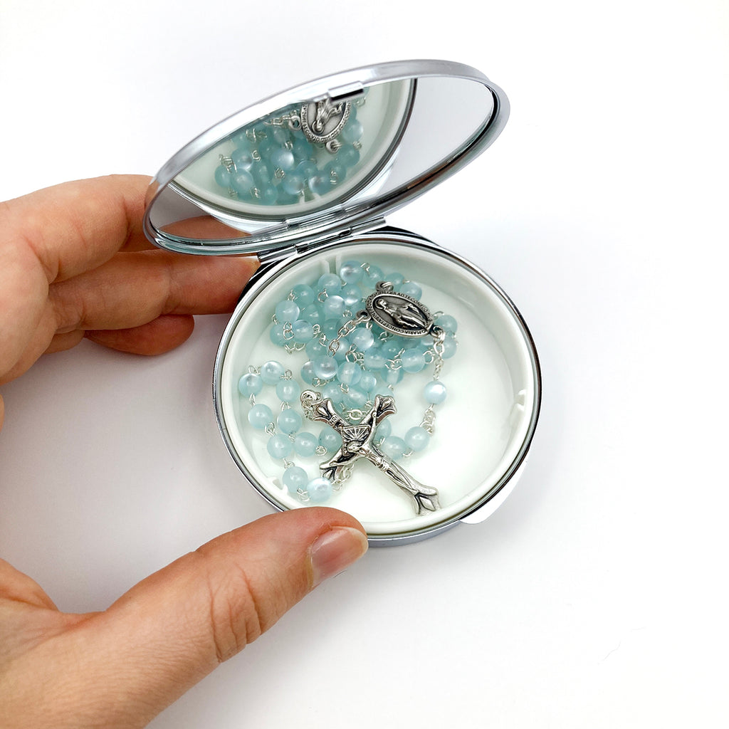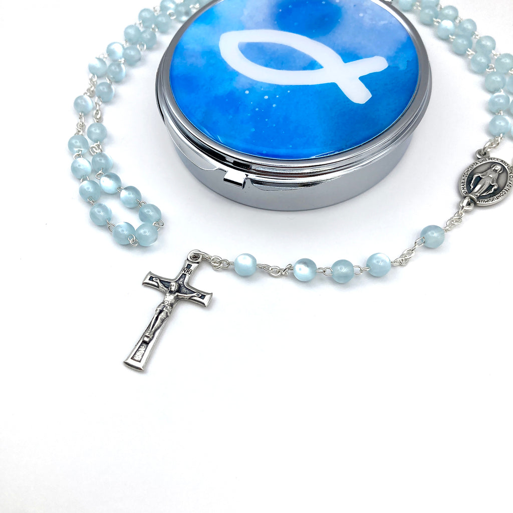 Schöner, hellblauer Rosenkranz mit Rosenkranzdose!