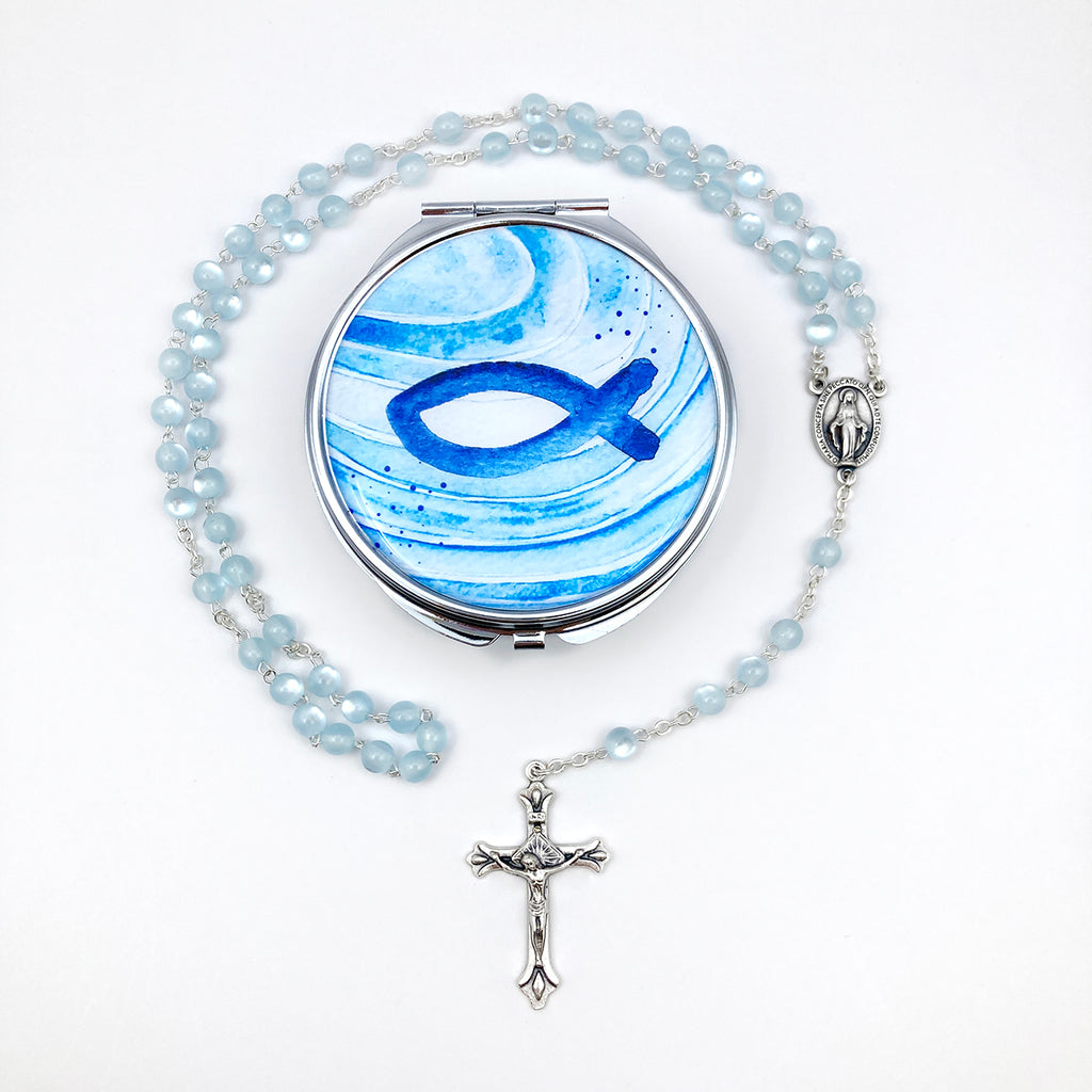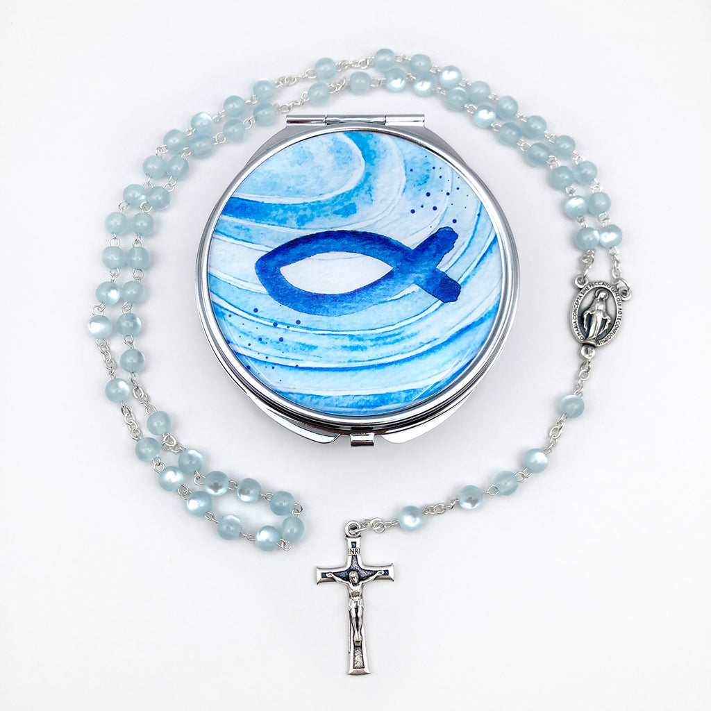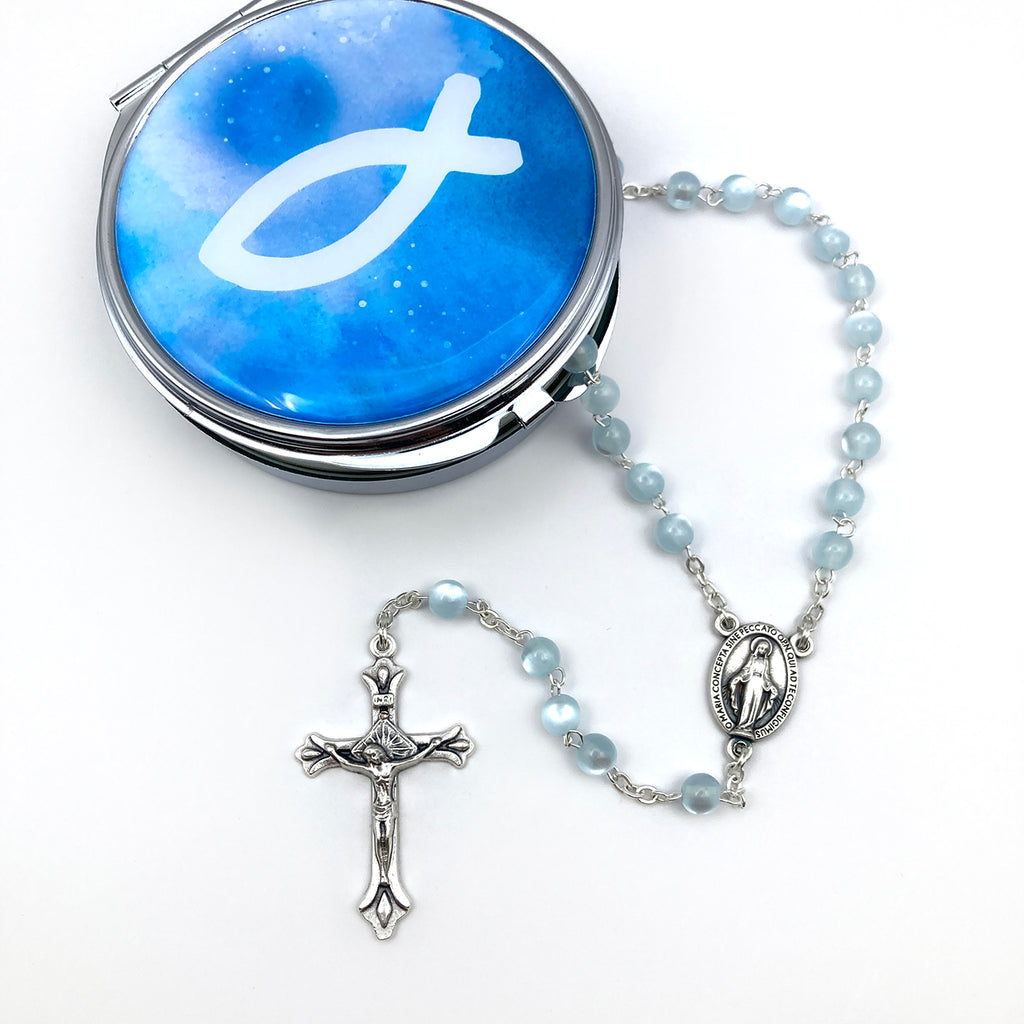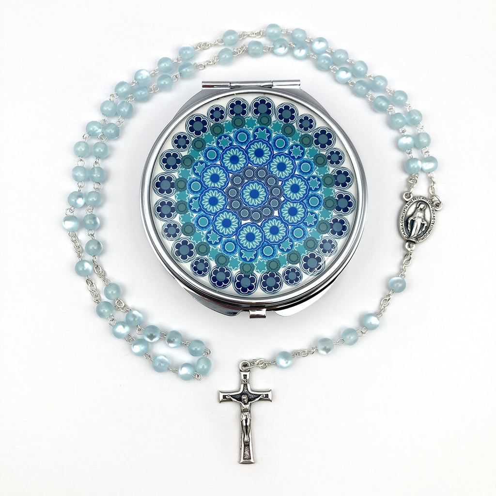 Schöner, hellblauer Rosenkranz mit Rosenkranzdose!