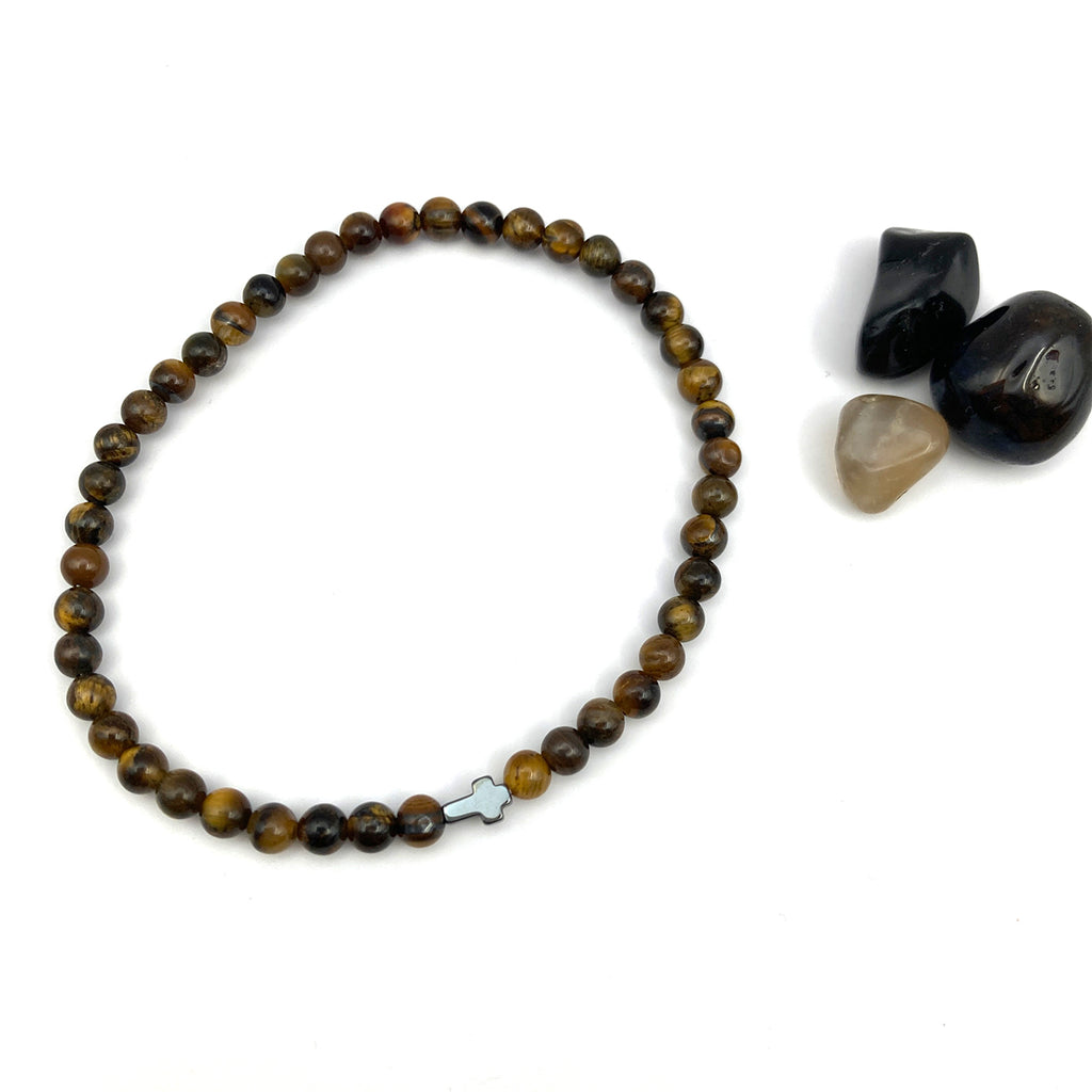Im Mittelpunkt steht ein kleines, dezentes Kreuz aus Hämatit-Edelstein in grau-schwarz. Es symbolisiert Glauben, Schutz und Hoffnung und macht das Armband zu einem besonderen Begleiter.